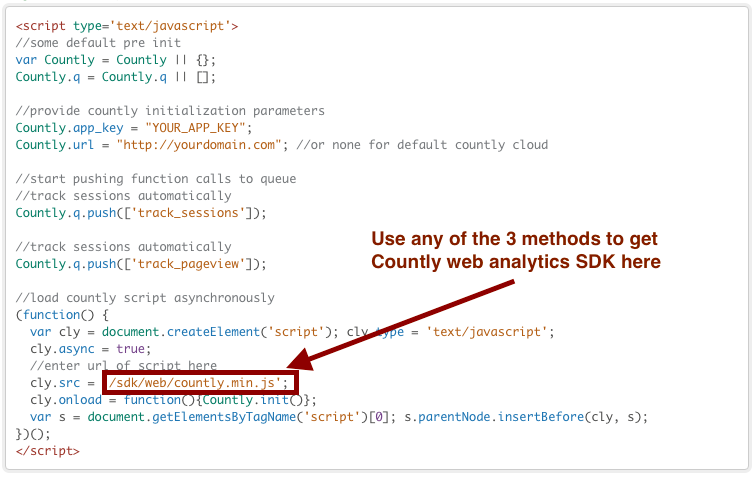 Link to the script and call helper methods based on what you want to track: sessions, views, clicks, custom events, user data, etc. More information is available at http://resources.count.ly/docs/countly-sdk-for-web