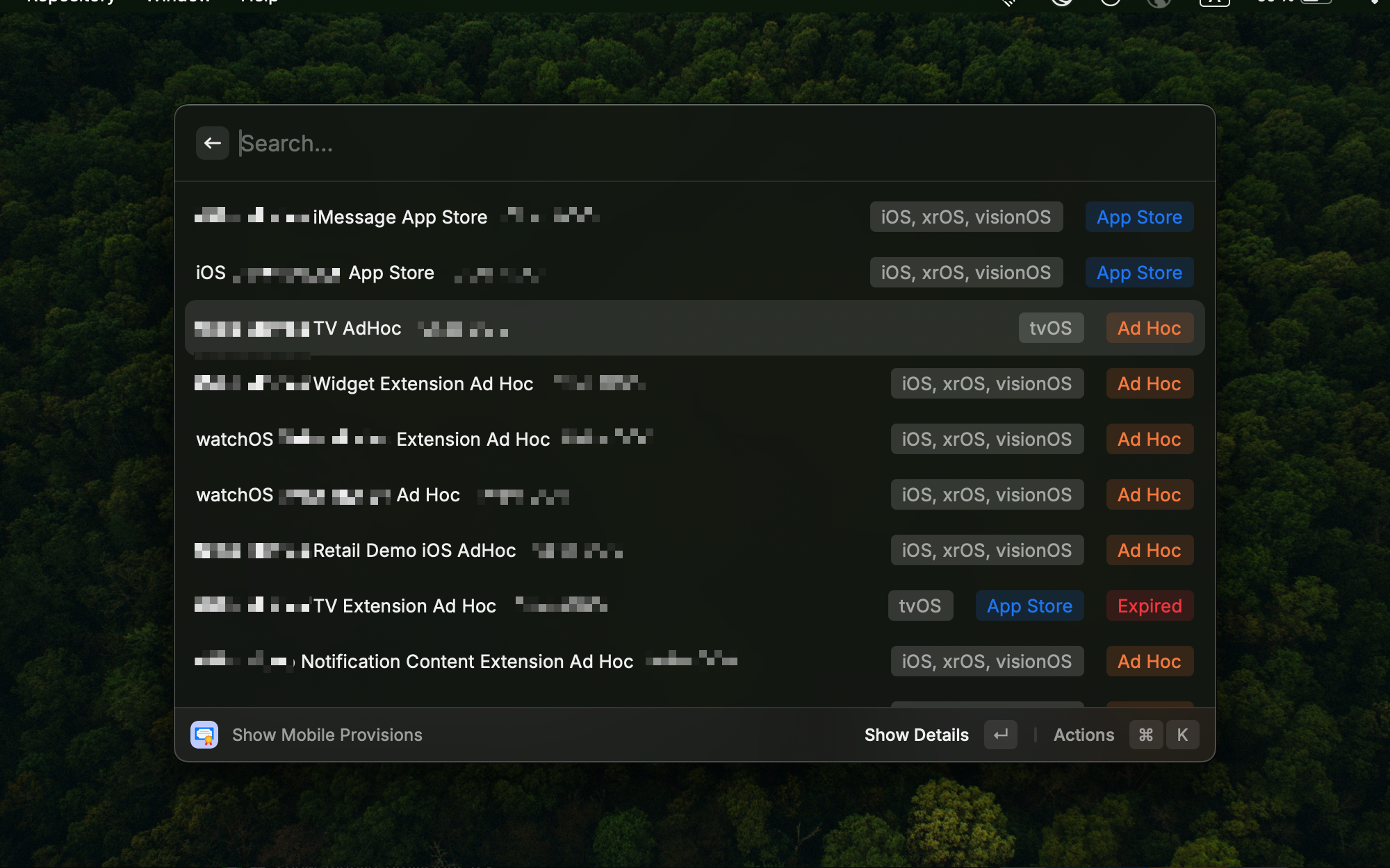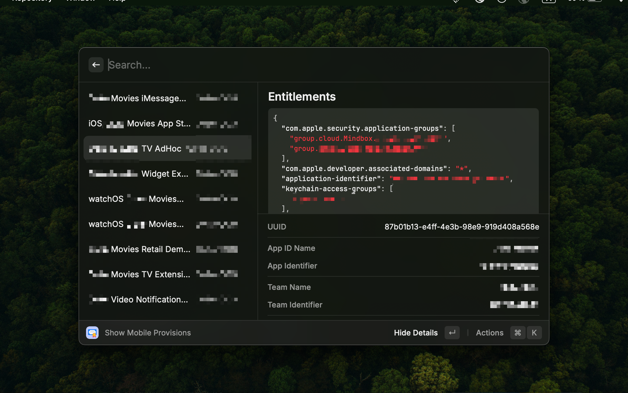 A Raycast extension that helps you manage and inspect Apple mobile provisioning profiles installed on your system. View detailed information about certificates, entitlements, provisioned devices, and more.