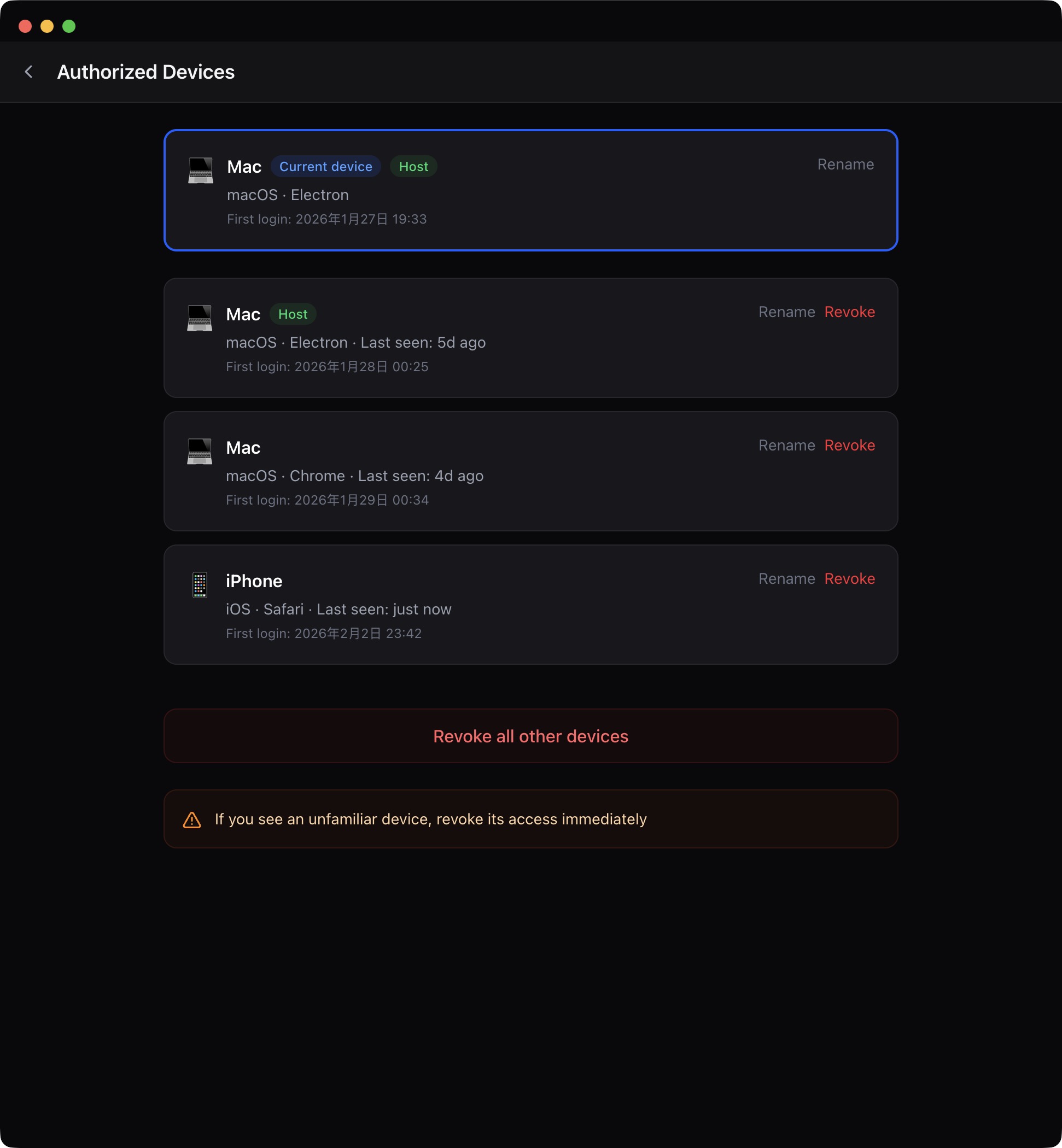 | Device Management | Manage connected devices, rename them, or revoke access |