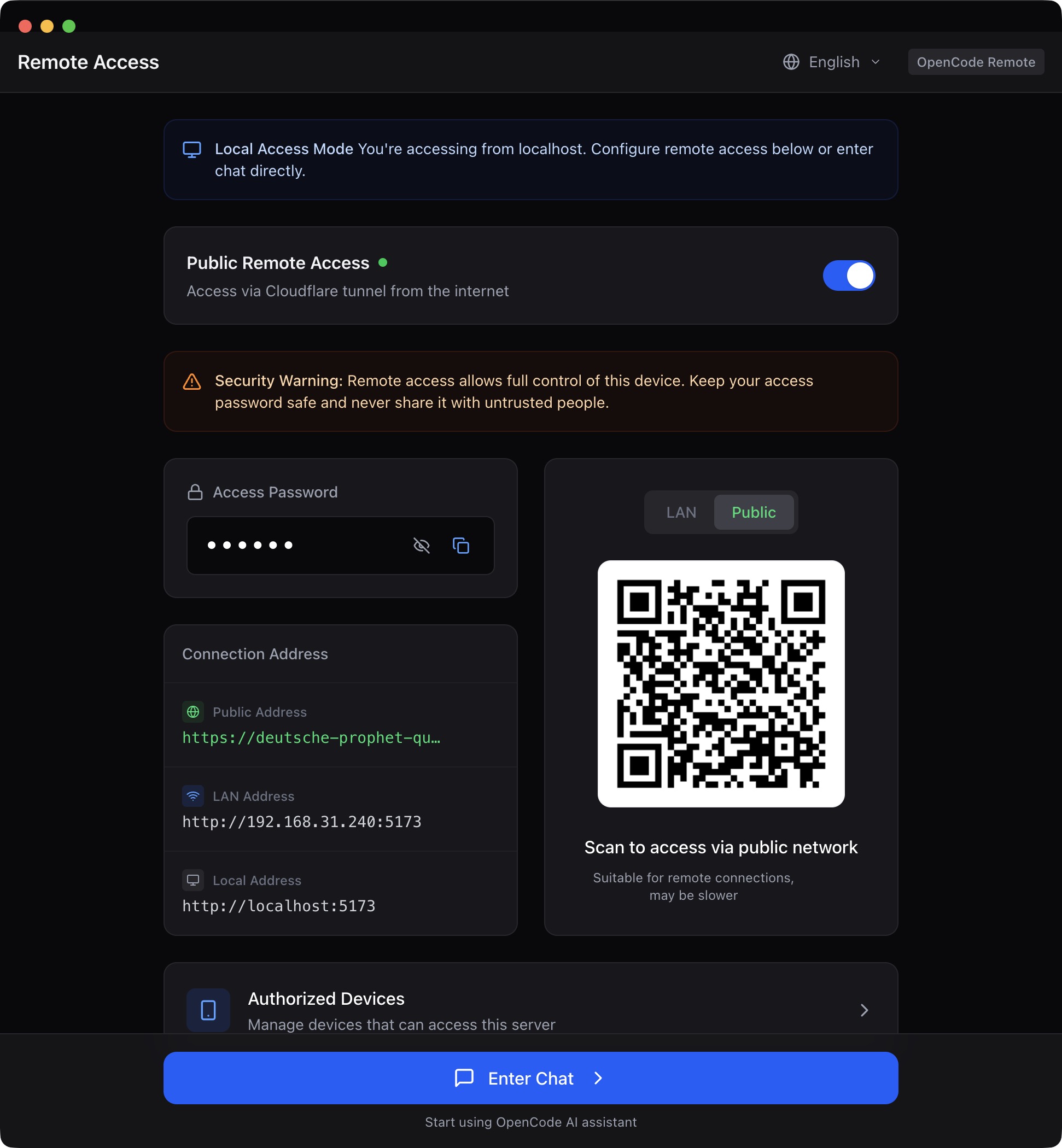| Desktop App | Native Electron app for macOS and Windows with bundled OpenCode and Cloudflare Tunnel |