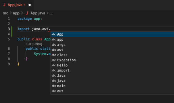 - Open a java file > Type "import java.awt." > Press ctrl+space