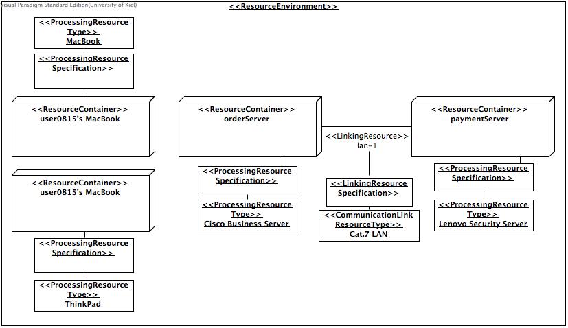 - Resource environment model, which includes different resource containers representing the available hardware components.