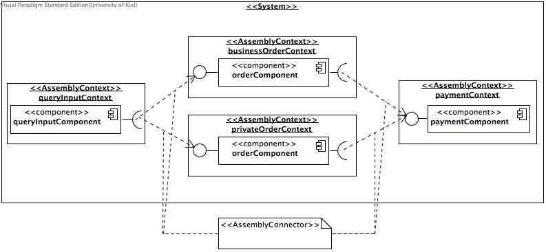 All contexts are connected with assembly connectors which also link the provided and required roles from the repository model to the connection.