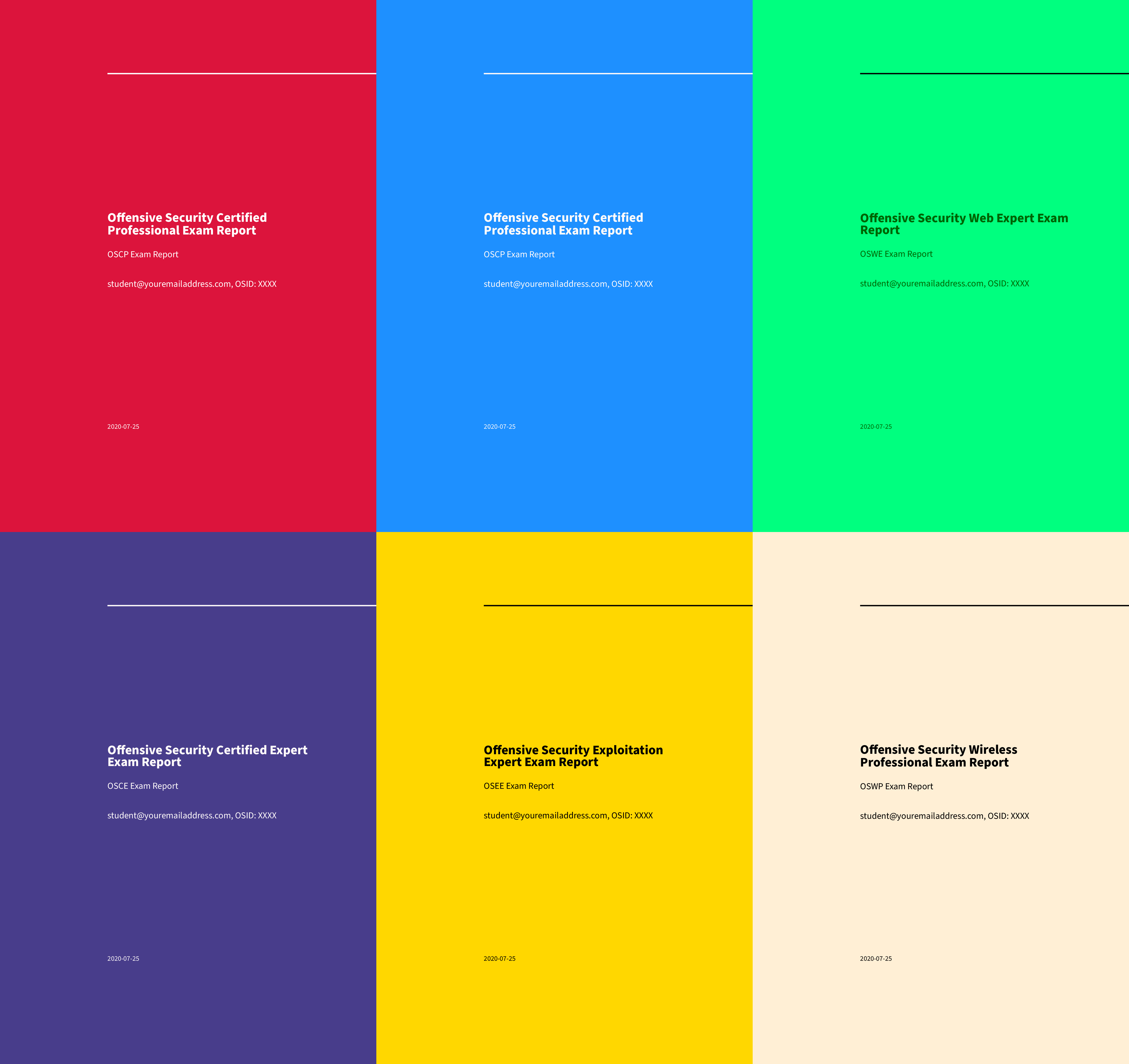 I created an Offensive Security Exam Report Template in Markdown so LaTeX, Microsoft Office Word, LibreOffice Writer are no longer needed during your Offensive Security OSCP, OSWE, OSEE, OSWP, OSEP, OSED, OSWA, OSDA, OSMR, OSTH exam!