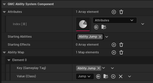 Now we need to hook the ability up to the ASC. Open up the CharacterBP, and select the attached GMC_AbilitySystem component. In the Details pane, under "GMC Ability System Component", the following needs to be set: