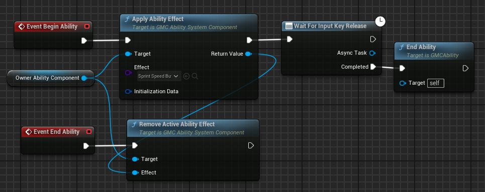 Now make a GMCAbility named "Sprint". In it, add a call to "Apply Ability Effect" where the SprintSpeedBuff Effect is applied to the ability owner's Ability Component. Then use an AbilityTask to wait until the input key is released and then end the ability. Finally, add an event node for "Event End Ability" that gets called when an ability ends. In this event, remove the SprintSpeedBuff Effect that was added.