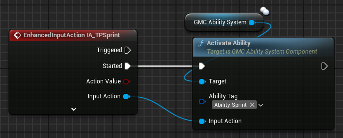 Then hook up the "IA_TPSprint" Started Event to Activate the ability. Make sure to connect the "Input Action" pin from the Event to the Ability, it's used for the "Wait For Input Key Release" task.