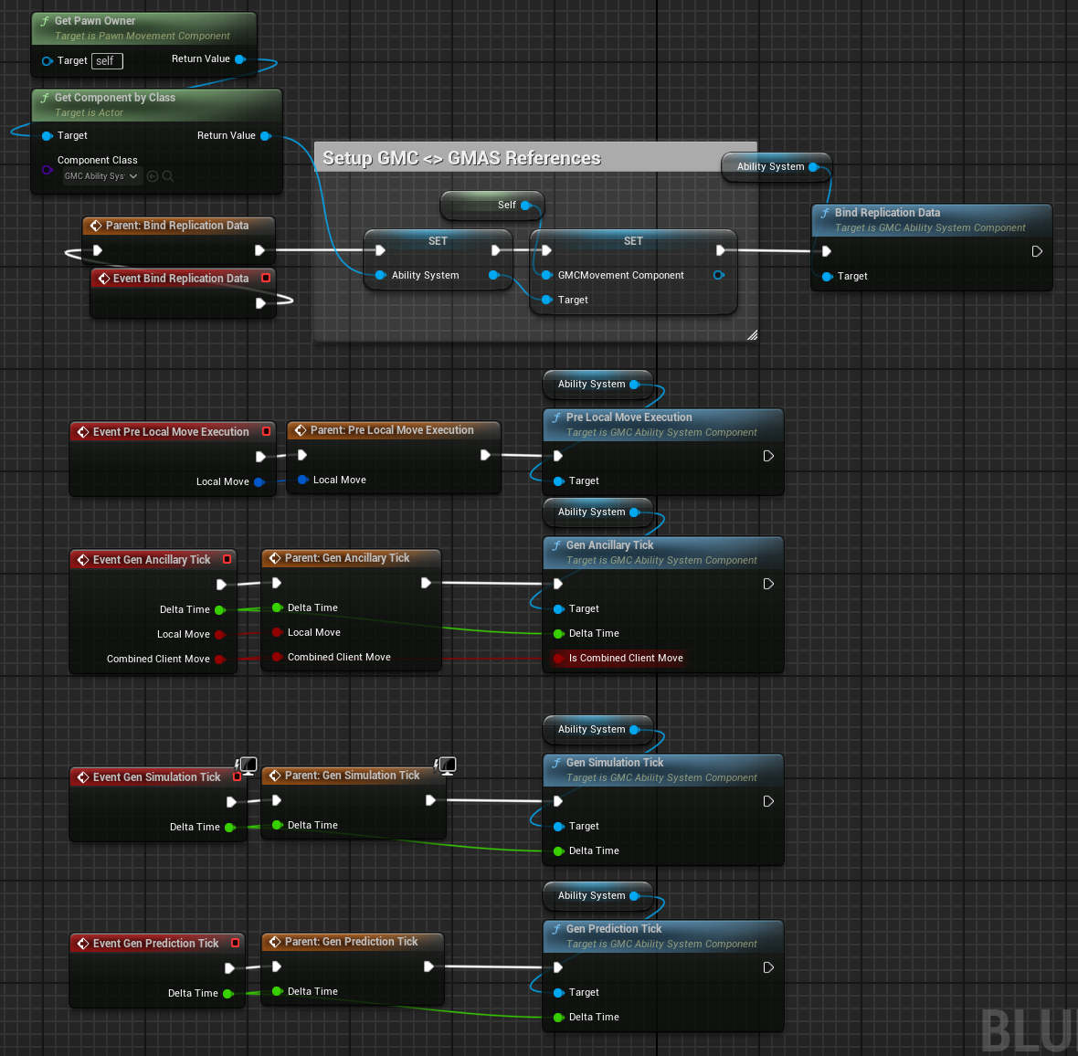 Then, open up the MovementComponentBP. Quite a bit needs to be done here, as it's where we'll be wiring GMC into the ASC. The ASC has matching functions for the relevant GMC Events that need to be connected.