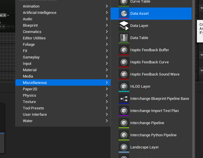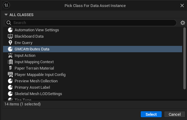 Create a new DataAsset Blueprint of type GMCAttributes Data and name it "Attributes":