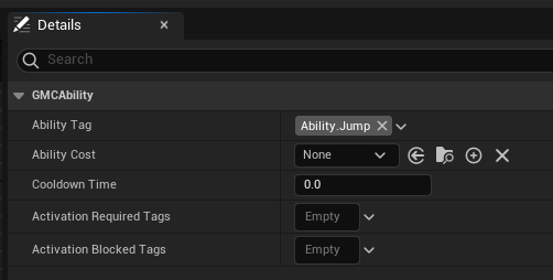 Open it up, and you'll see an empty Event Graph. In the Details pane, set the Ability Tag to Ability.Jump. Ignore everything else in the Details pane for now.