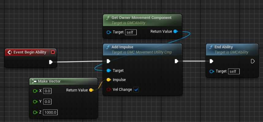 In the event graph, add the Event Begin Ability node. This is triggered whenever an ability is activated, and is the main entry point to every ability. All this ability will do is add an Impulse in the Z direction to the MovementComponent. There is a helper method to get the movement component. Setup the ability to look like: