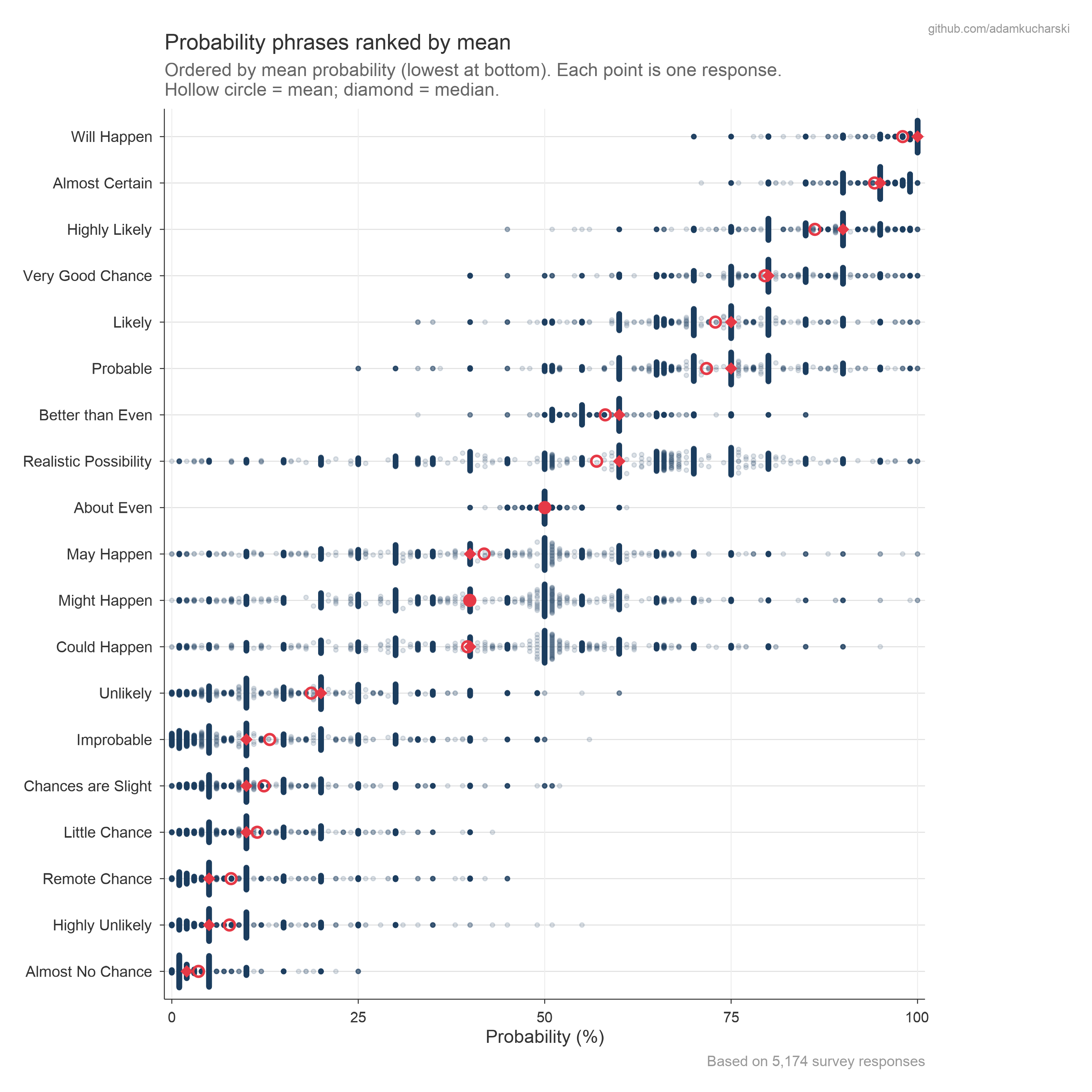 - alt: Chart showing the distribution of estimated probabilities for different phrases, ranked by mean. Will Happen is top, and Almost No Chance is bottom.
