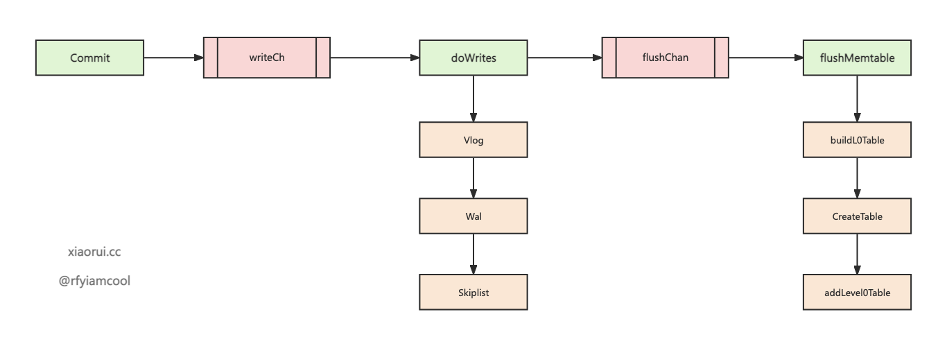 先判断 entry 的 value 是否属于大 value, 如果符合则需要把 value 写到 vlog 文件里, 然后把 entry 写到 wal 日志里, 接着再写到 memtable 里. 在处理写请求时, memtable 会转换为 immutable memtable, 然后经由 flushMemtable 把 memtable 构建为 sstable 对象, 最后经过数据经过加工和布局调整后进行持久化.