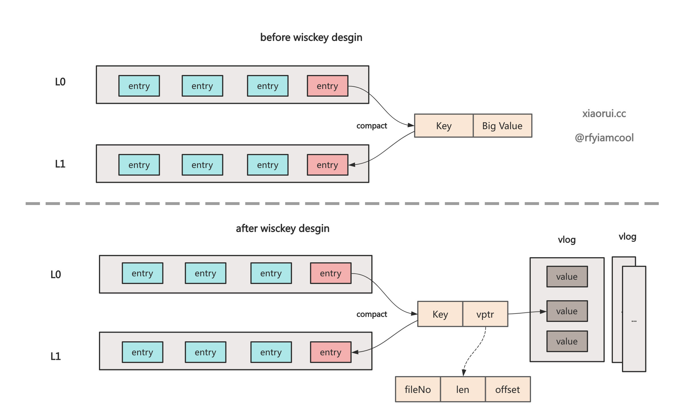 }badger 的 wisckey vlog 的设计还是很复杂的, 其设计目的是为了避免大 value 在 sstable compact 合并时带来的写放大问题.