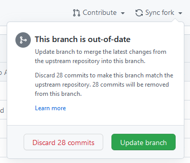 While you are working on your fork, there may be changes to the main branch. In order to get these to register on your fork, you can use the Update Branch option under Sync Fork as shown below to update your fork to reflect those changes.
