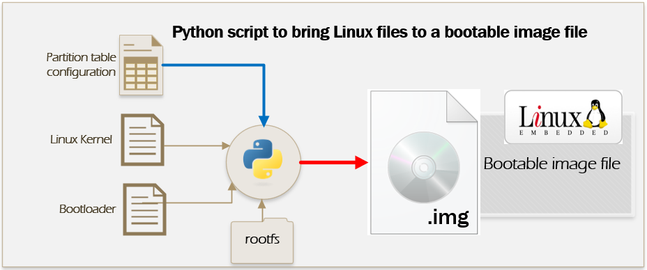 The script can be used inside an other Python application or it can be executed as a console task. In the console mode is a simple XML-file used to describe the partition table of a final image file. Then the script generates folders depending on the image configuration. In the next step it is enabled for the user to copy files and folders to the partitions. These files will be added to the final image file. The script can automatically compile Linux device tree (.dts)-files, unzip archive files, like "tar.gz" or "zip", and can calculate the required partition size for the entire content.