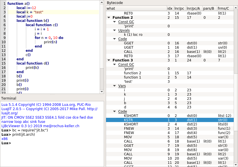 The viewer can be used to edit and compile Lua source code and display it side by side with its corresponding LuaJIT bytecode. The test VM implements a subset of LuaJIT bytecodes to study and validate their functions (see the examples subfolder).