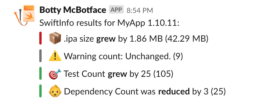 By default SwiftInfo will assume you're extracting info from a release build and send the final results to Slack, but it can be used to extract info from individual pull requests as well with the danger-SwiftInfo danger plugin.
