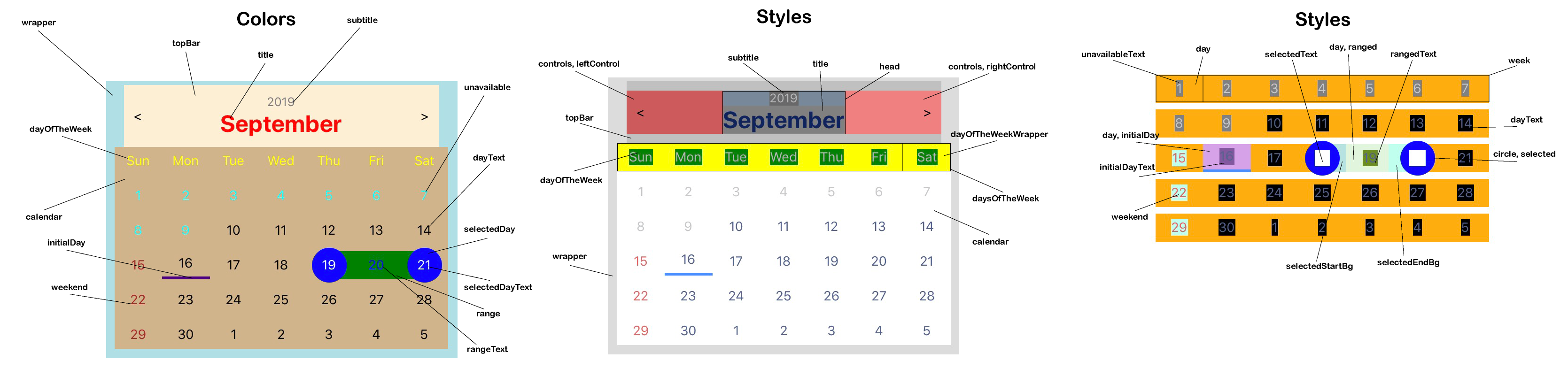 All styles could be overwritten. If you want you can also easily change only colors. Below you can see what values are responsible for styles or colors, you can override them in userStyles or userColors.(Components are colorized just to facilitate understanding)
