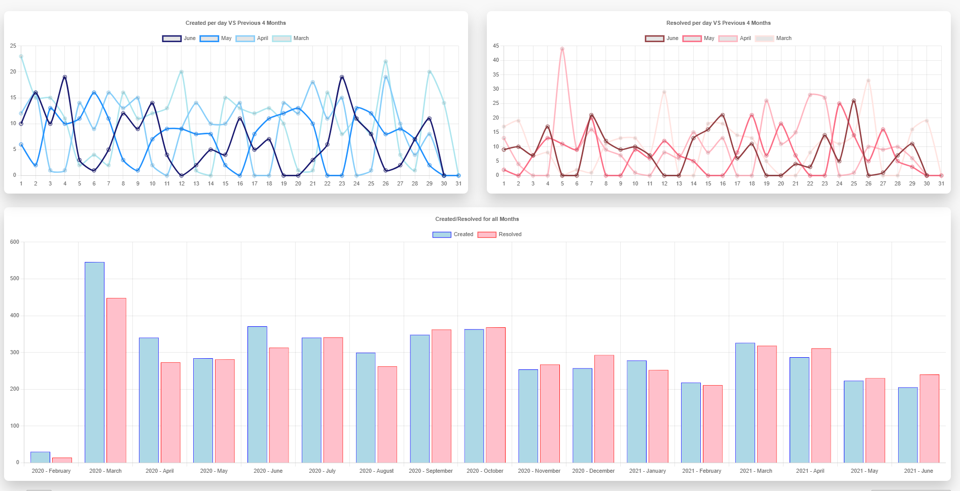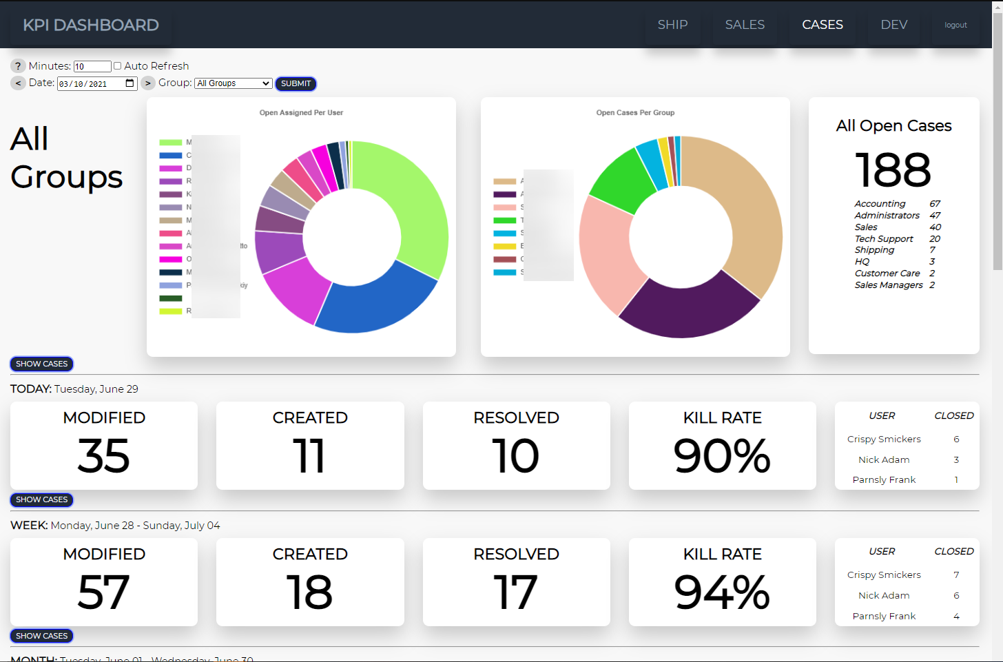 We show all the cases that have been worked on, created and resolved in a given time frame. We also show how many cases each user has resolved. Data is shown for the current selected day, the day's week and the day's month. As an option, a table can be displayed showing all the cases for a given time frame. This data is segragated by group.