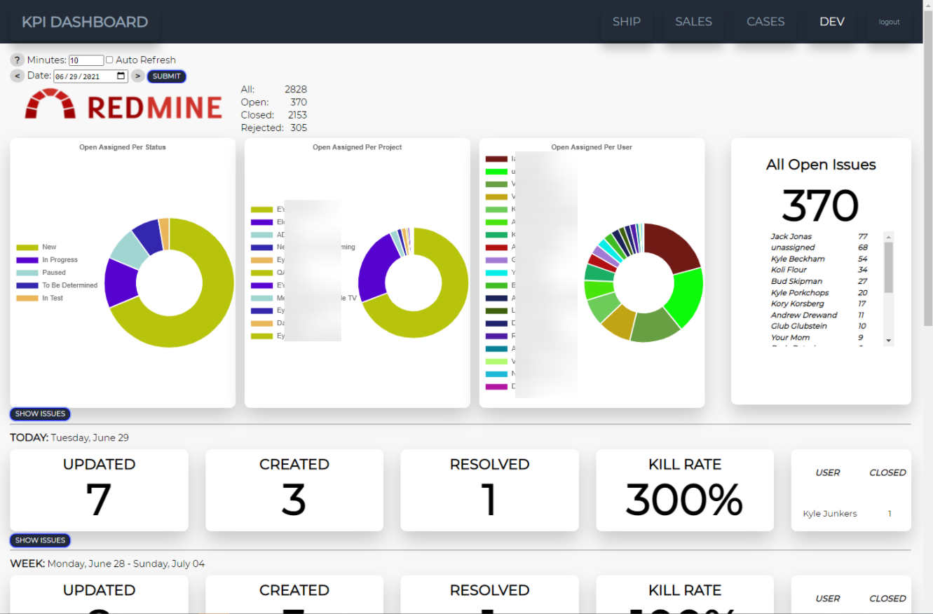 The file VTiger_KPI_Dashboard/redmine_api.py is used to gather data about the issues and pass it into the Django DB. We only retrieve issuse that were updated in the past month on the regular interval. This can be easily changed depending on the scale of issue changes.