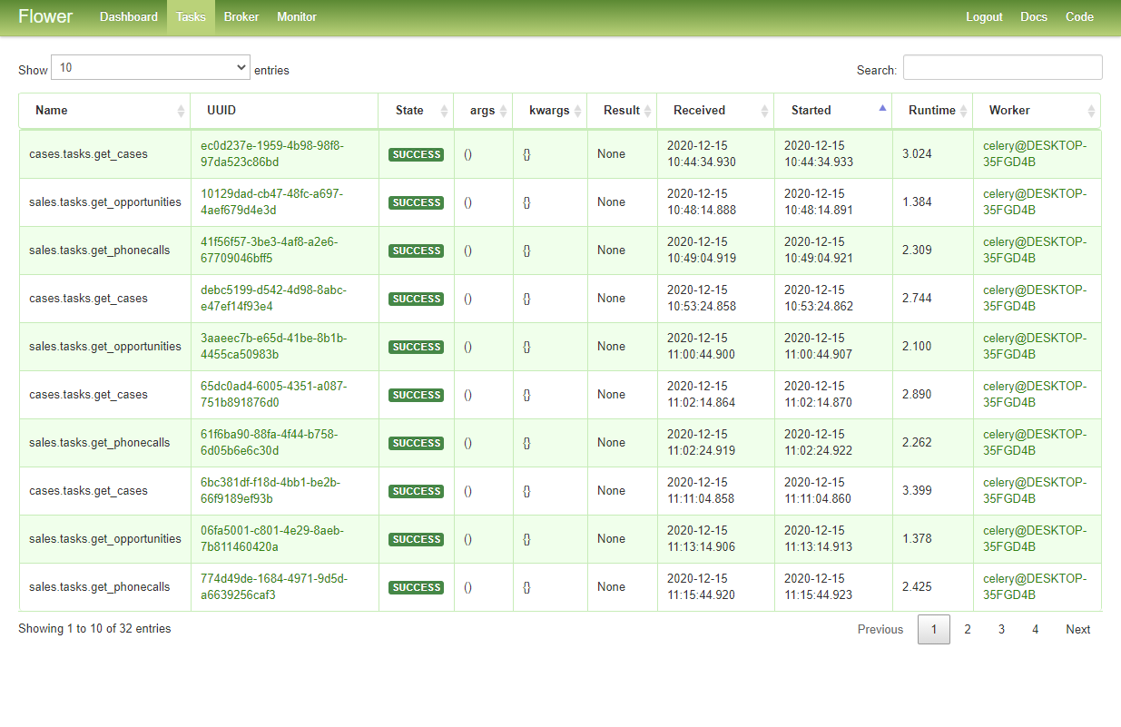 python3 manage.py runserver 0.0.0.0:8000Afterwards, you should be able to access the dashboard locally at http://127.0.0.1:8000 Flower can be accessed locally at http://127.0.0.1:5555