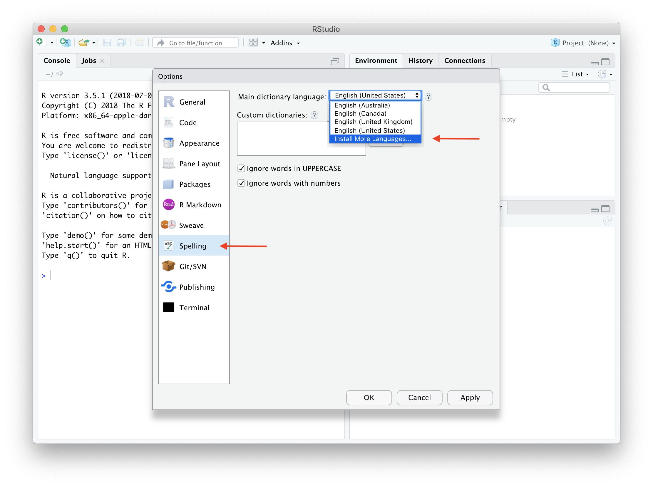# RStudio README.md:8For more information about the underlying spelling engine and how to add support for other languages, see the hunspell package.