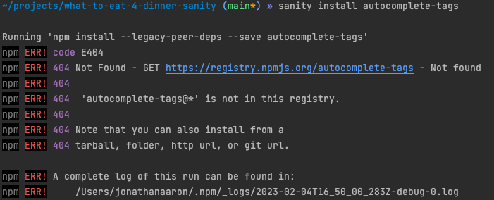 I run: sanity install autocomplete-tags in the terminal and I get the error in the following screenshot