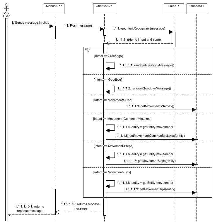 Briefly, when a user sends a message through the chat of the mobile app, a ChatBotAPI (Azure Bot Service) is called. Then, the LUISAPI (Language Understanding) is invoked. The main goal of this service is to find the intention behind the user message using a model prediction based in machine learning. After the return of the most scored intent from LUISAPI, the ChatBotAPI analyzes what is the behavior of the respective intent, and, in most cases, the FitnessAPI is called to return the data from the database. In the end, the message is returned to the mobile application allowing the user to see the ChatBot response.