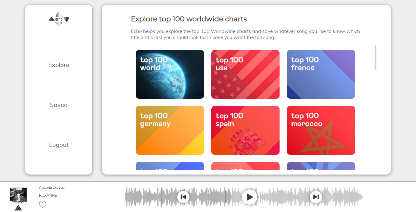 echo Top100WorldwideCharts Explore top 100 tracks in diffrent countries around the glob Stack: ReactJs Firebase Axios WavesurferJs Sass Redux Redux thunk Pose. Check the demo from here