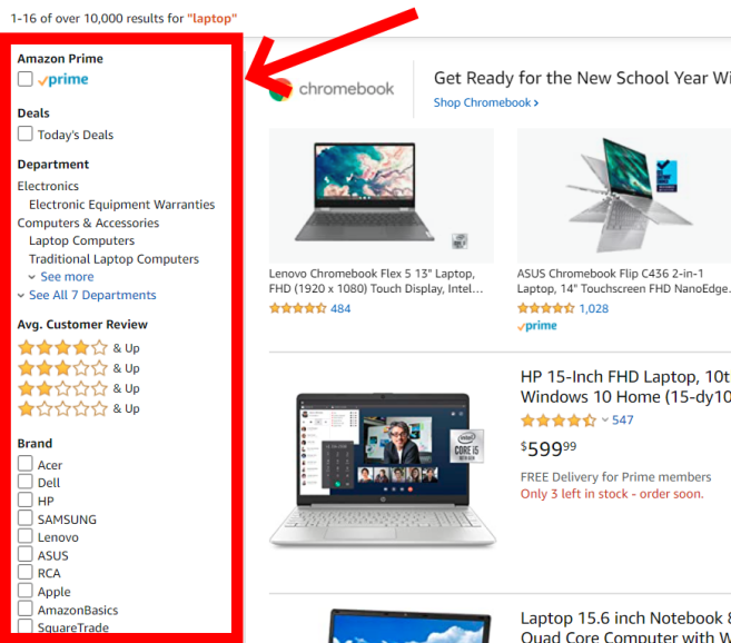 Most of the shopping site like Amazon,Flipkart have option to categorization or filtering producing based on customer requirements like Rating,Brand,Price range etc which can found at left hand side of the screen in most of the case