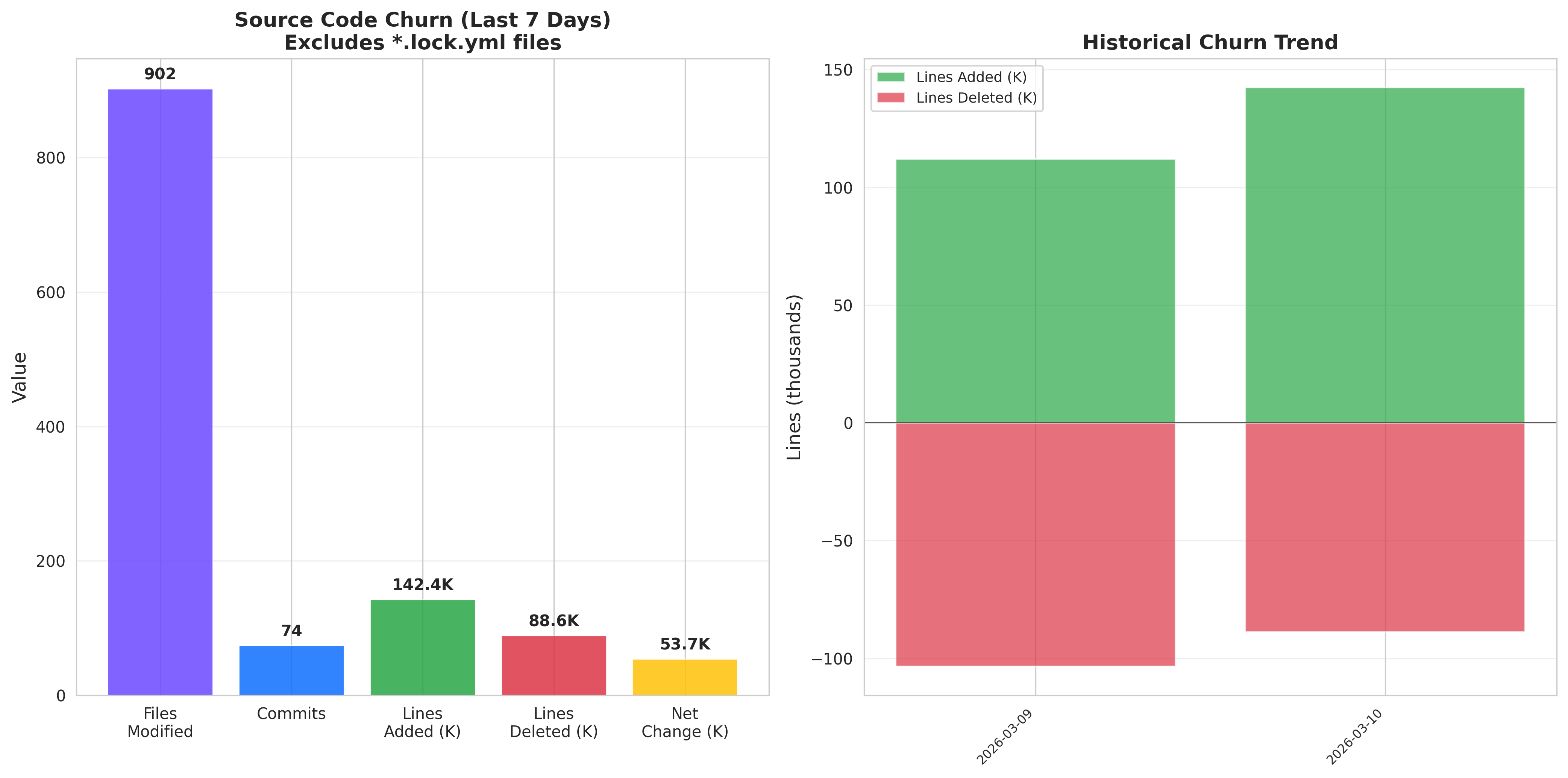 Note: The current 7-day window contains a single large initial commit. Using previous period data for churn context: ~74 commits modified ~902 files (+142K/-89K lines, net +54K). Lock file churn is tracked separately (17