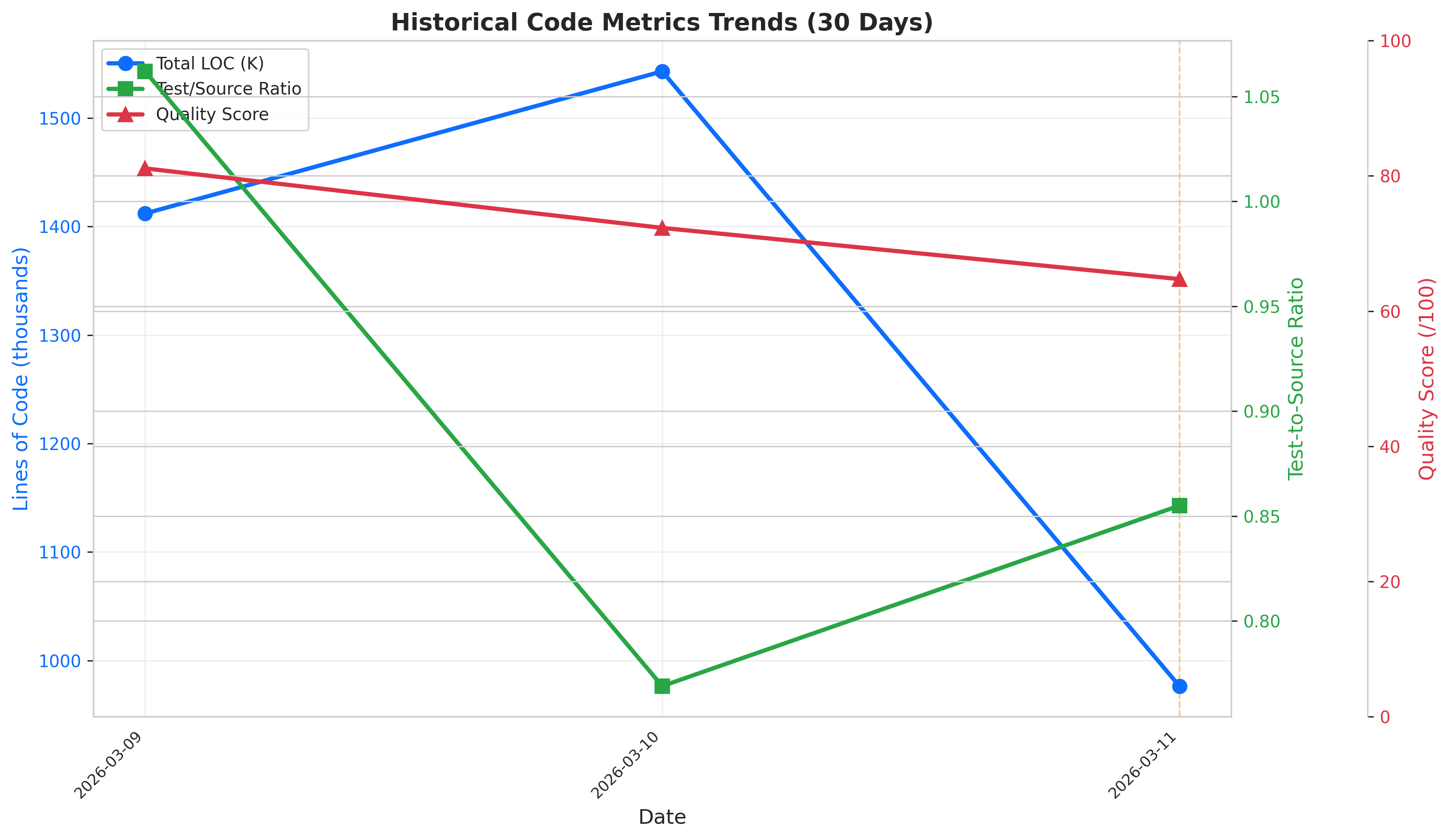 Three data points (2026-03-09 through 2026-03-11) show LOC growing significantly, test ratio stabilizing near 0.85–1.06, and quality score declining from 81 to 65 — primarily driven by increasing large file count and documentation gap.