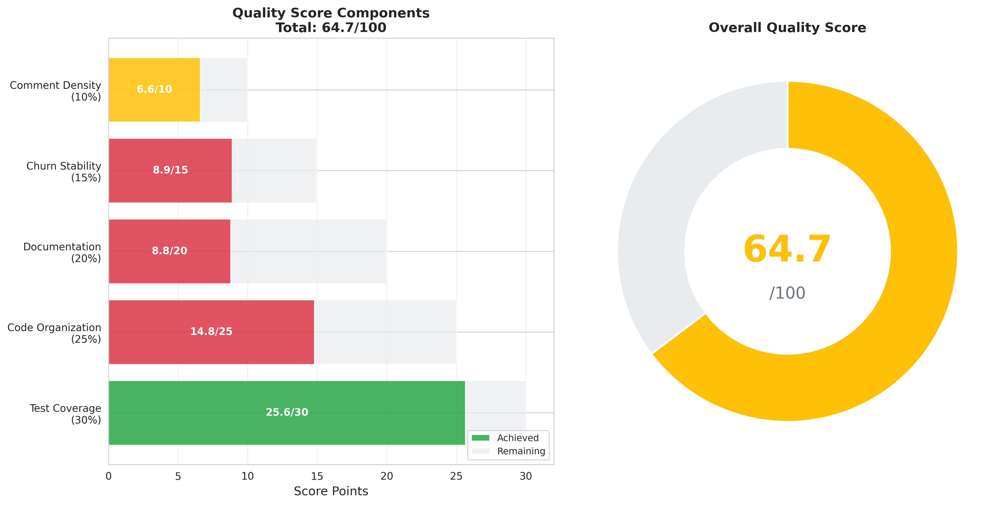 Overall quality score: 64.7/100. Strong test coverage (25.6/30) and reasonable churn stability (8.9/15) and comment density (6.6/10). The weakest components are documentation ratio (8.8/20) and code organization (14.8/25 due to 339 large files).