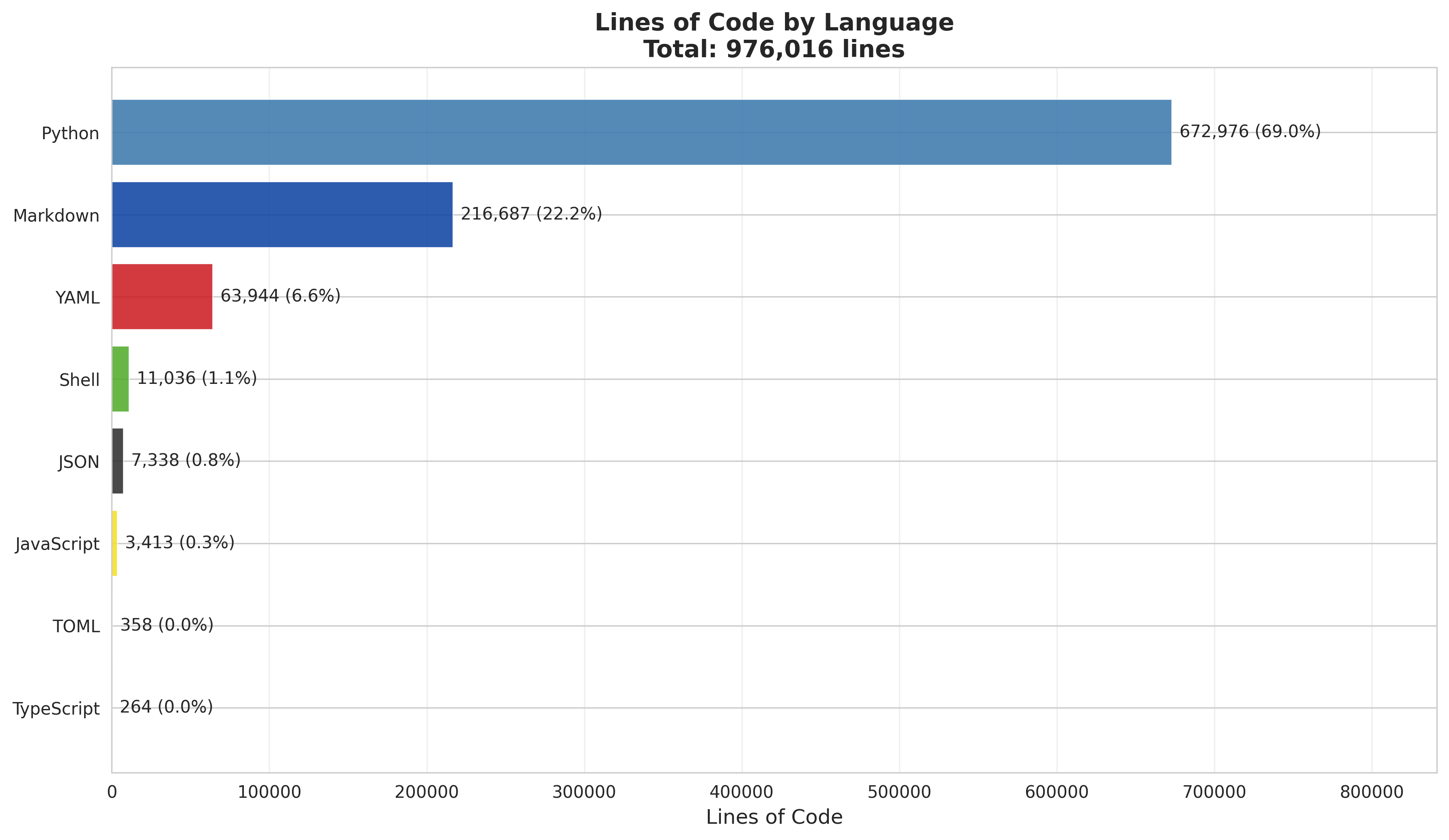 Python is the clear dominant language at 672K LOC (68.9%), followed by YAML at 64K (6.6%) and JavaScript at 3.4K. TypeScript has minimal presence (264 LOC, 1 file). The codebase is Python-first with a substantial YAML configuration footprint from workflows and agent definitions.