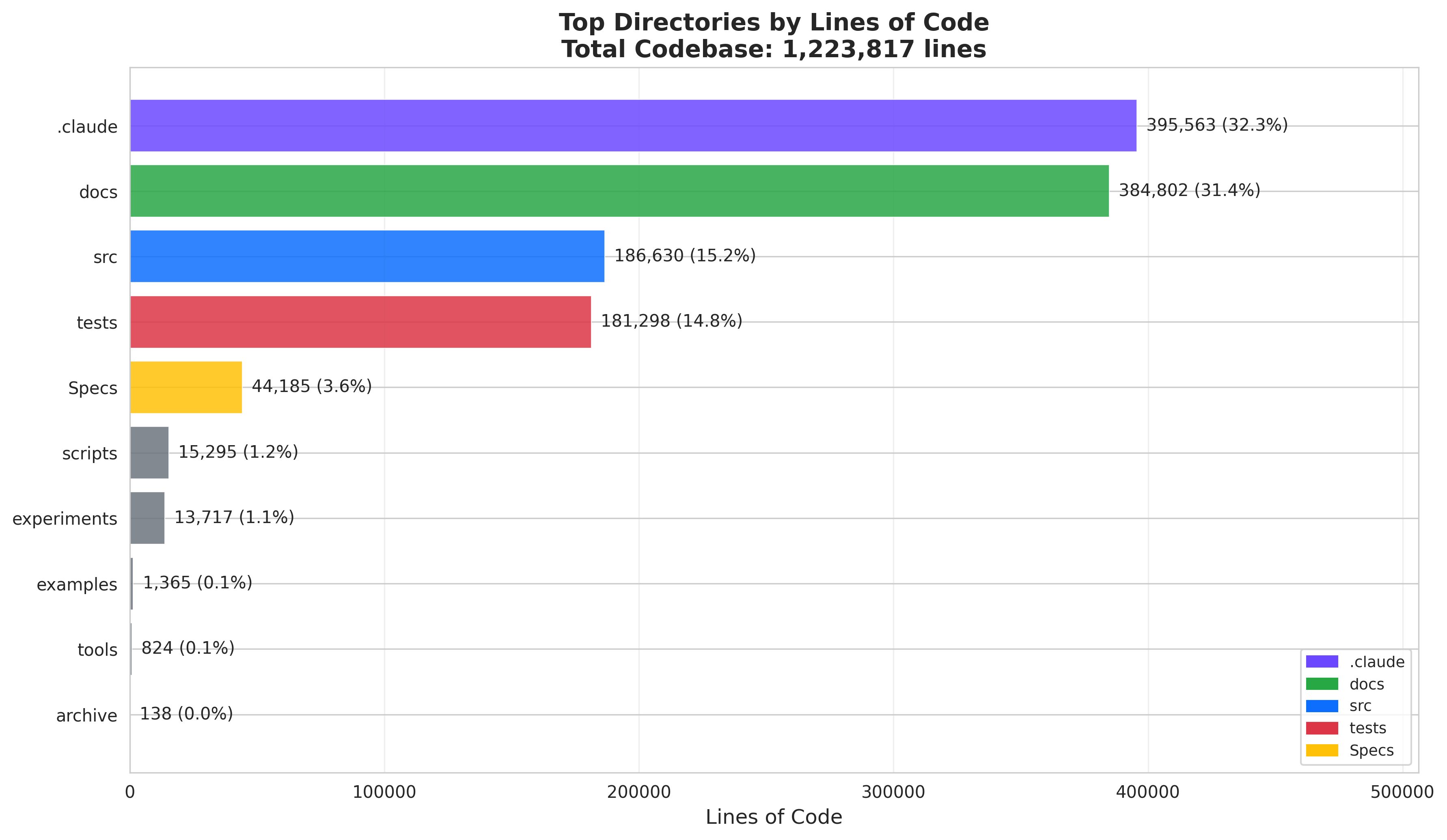 .claude (395K LOC, 40.5%) and docs (384K LOC, 39.4%) together account for nearly 80% of the codebase. The src directory holds 186K LOC (19.1%) of primary source code, tests has 181K LOC, and Specs rounds out the structure at 44K LOC.