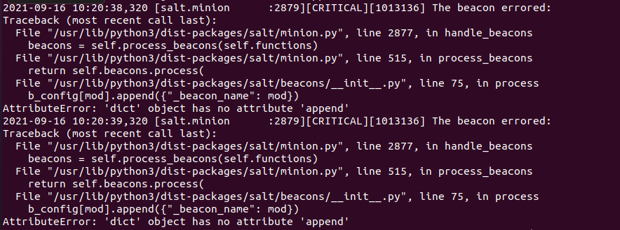 When adding the two config items to an Ubuntu salt-minion it created this error every second (typed by hand... please forgive or inquire about mispellings