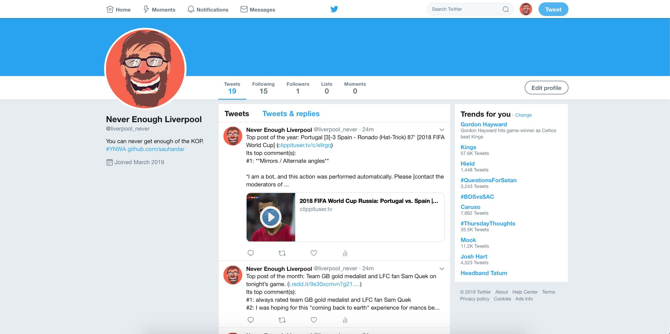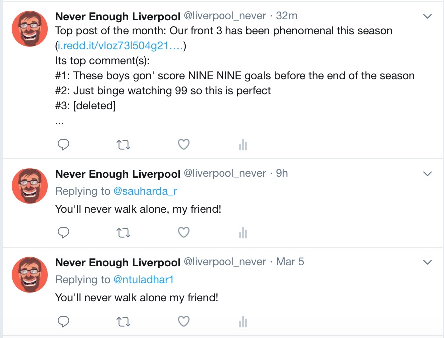 A cheeky bot that tweets out Liverpool related content using the Twitter (tweepy) and Reddit (praw) APIs. Because you can never get enough Liverpool.