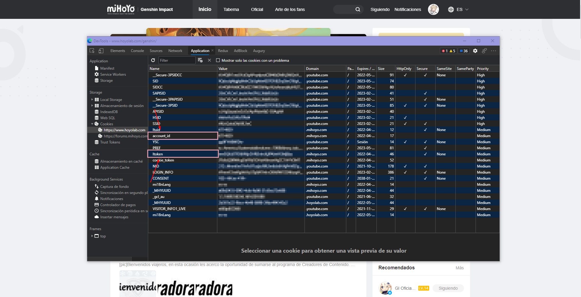 3. Go to the category Storage, open the option Cookies and open the option called https://www.hoyolab.com/.