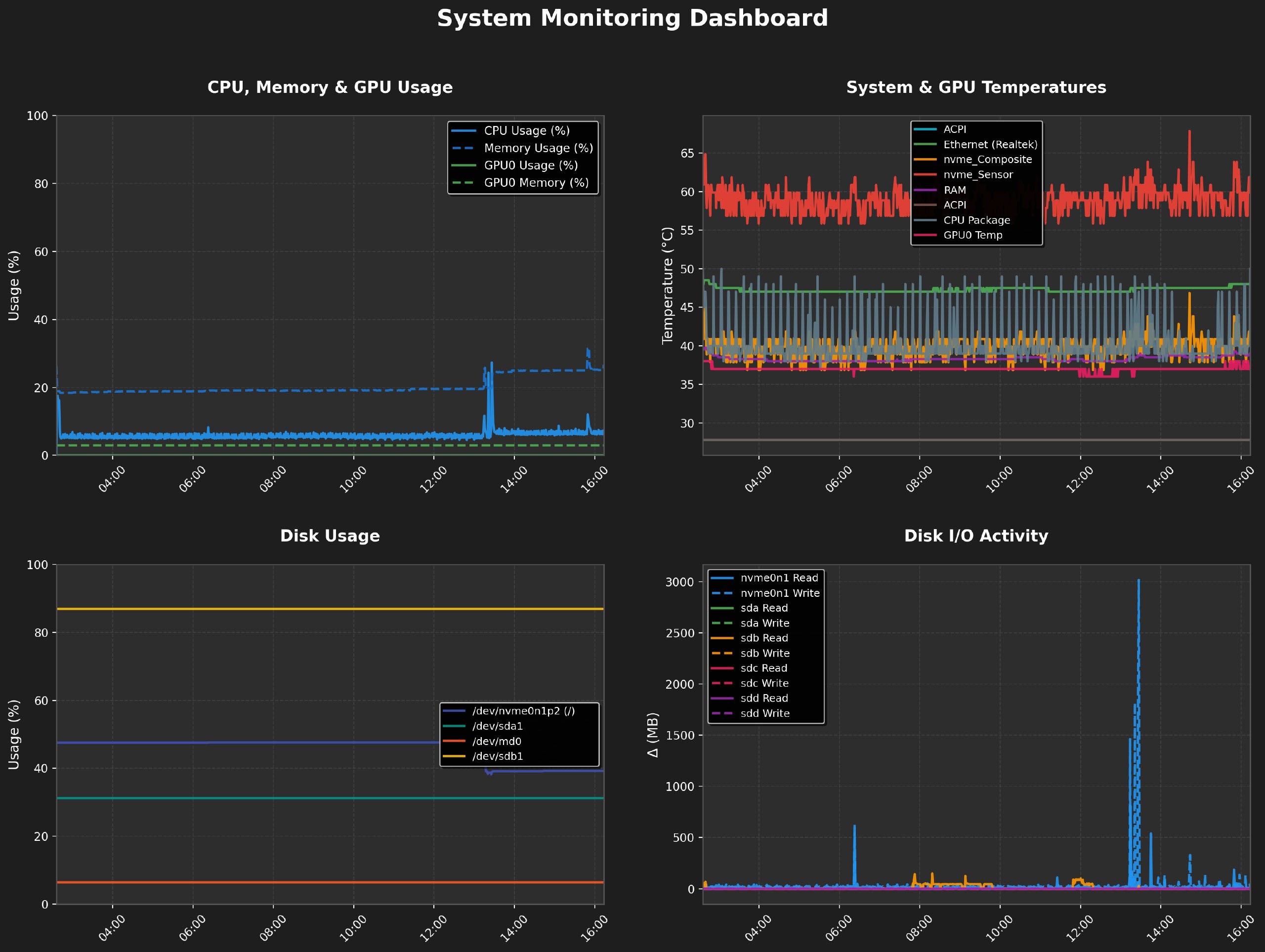 - Synchronized Graphs: CPU/Memory usage, temperatures, disk usage, I/O activity