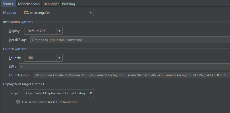 To make local development more convenient, you can use the following run configuration to launch Tachiyomi directly at the Browse panel: