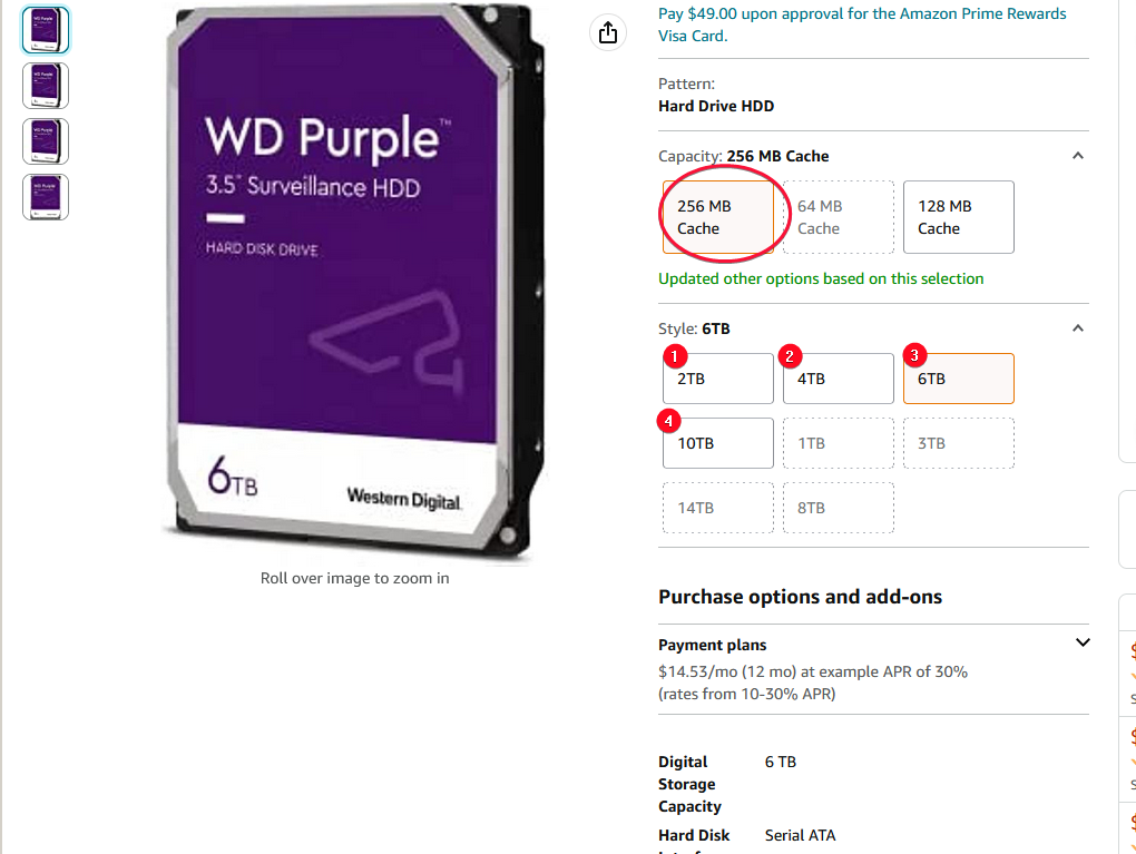 I'm looking at adding another Western Digital Purple and notice there are three options for memory cache. The size of the drive is affected by which amount of memory cache you select. For instance, the largest drive, 14TB, only comes with a 128 MB cache. If I specify 256 MB cache, then the 14TB drive is not available, the largest is 10TB, so there is a trade-off.