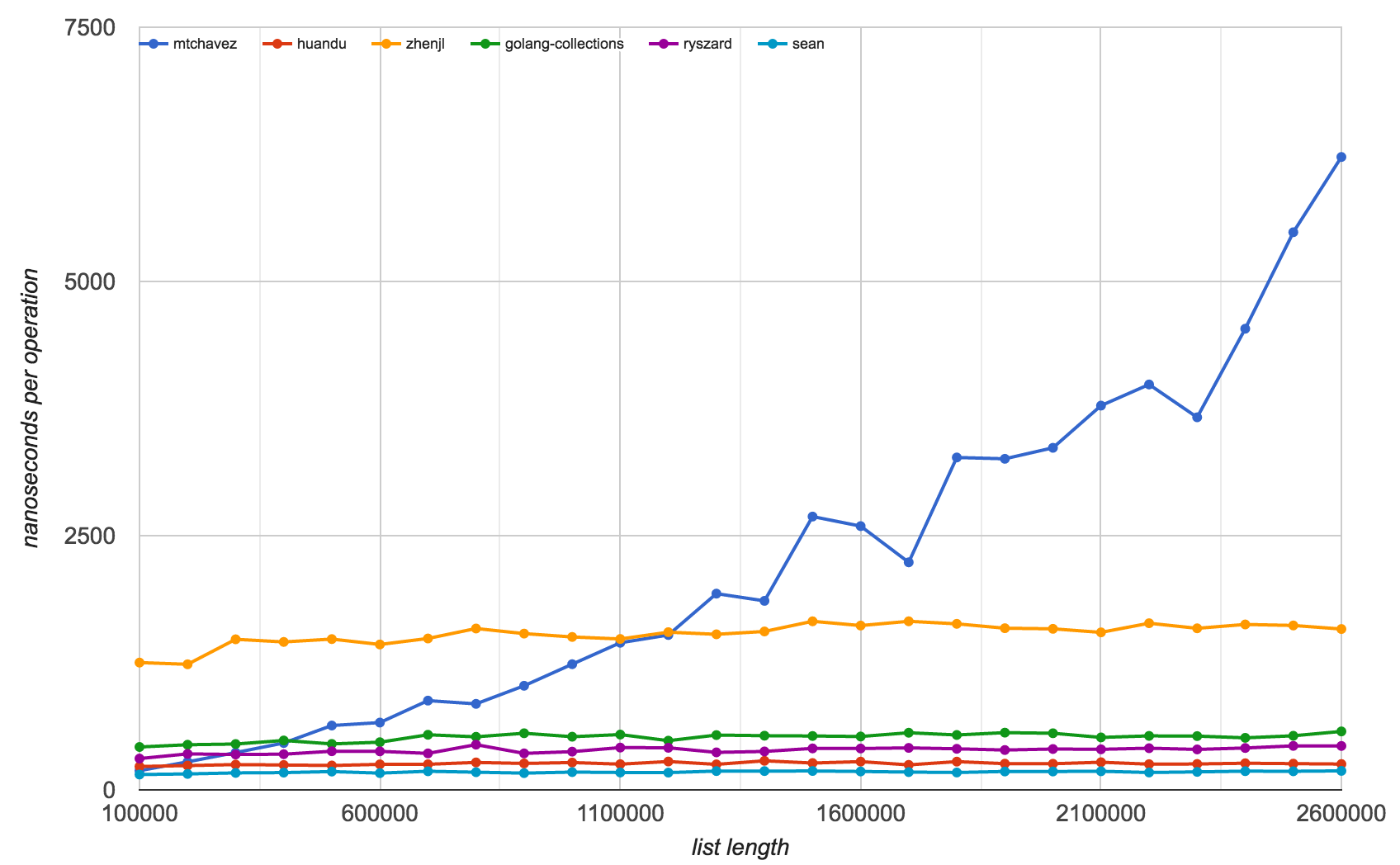 Worst-case inserts. These inserts are at the end of the list, requiring searching all the way to the end and then adding the new node. As you can see, mtchavez does not scale as well as the other implementations, which only show a small variance even after millions of nodes are added.