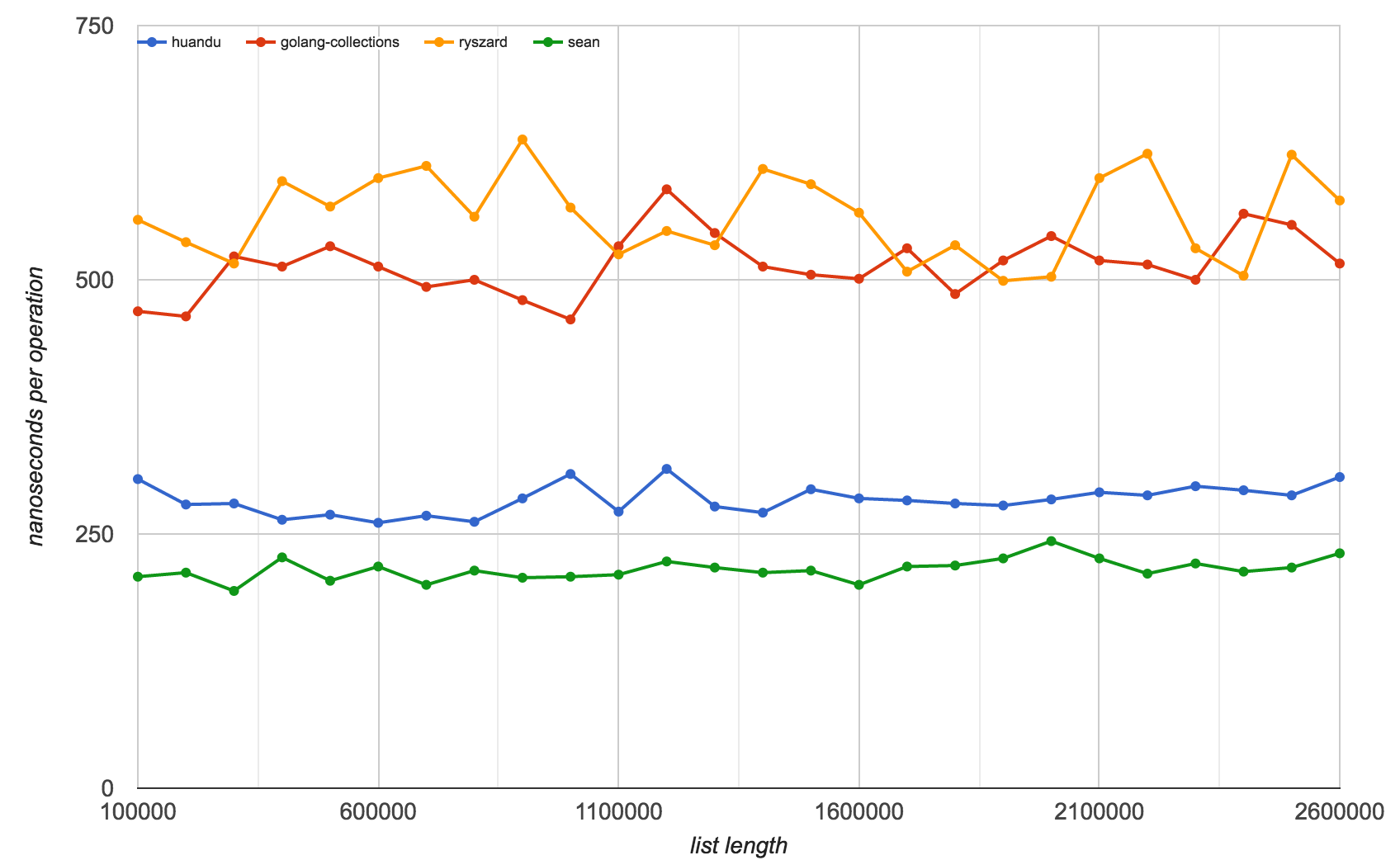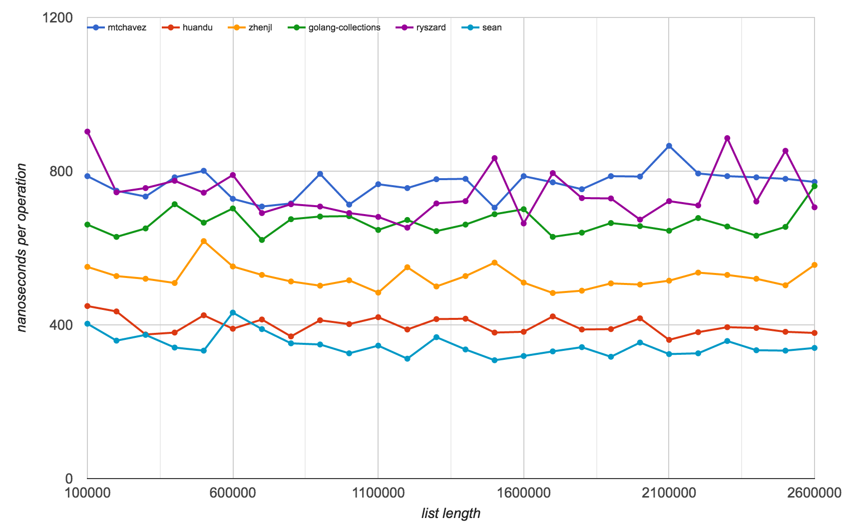 The chart above shows the best-case insert speeds. The vertical axis is nanoseconds per operation and the horizontal is the number of items in the list. These are the "best" inserts because they happen at the front of the list, which shouldn't require any searching. The difference in speed here demonstrates the overhead each package introduces in even the most basic operations.