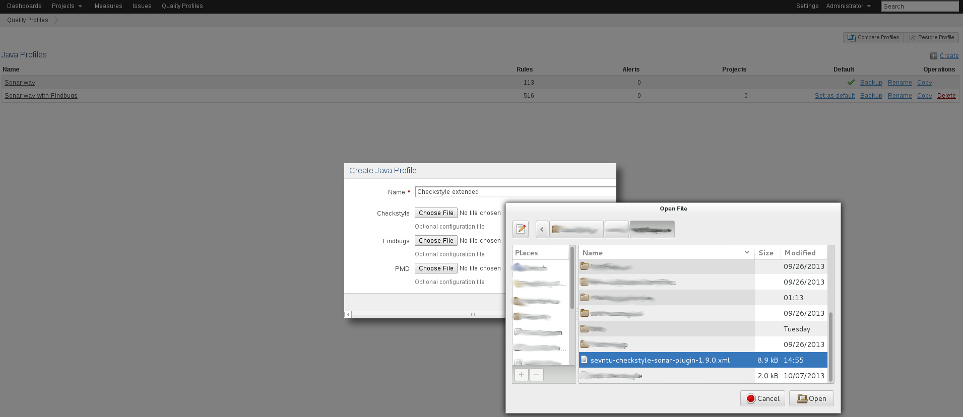 - In Quality Profiles tab create a new profile by importing "sevntu-checks.xml:https://raw.githubusercontent.com/sevntu-checkstyle/sevntu.checkstyle/master/sevntu-checks/sevntu-checks.xml checkstyle configuration. Set profile as default