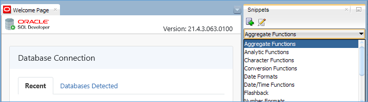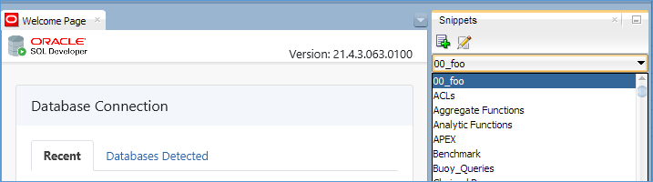 User snippet categories do not appear in SQL Developer Snippets window. But user snippets do appear under Edit Snippets.