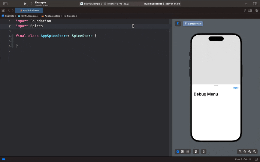 }The example projects in the Examples folder shows how Spices can be used to add an in-app debug menu to iOS apps with SwiftUI and UIKit lifecycles.