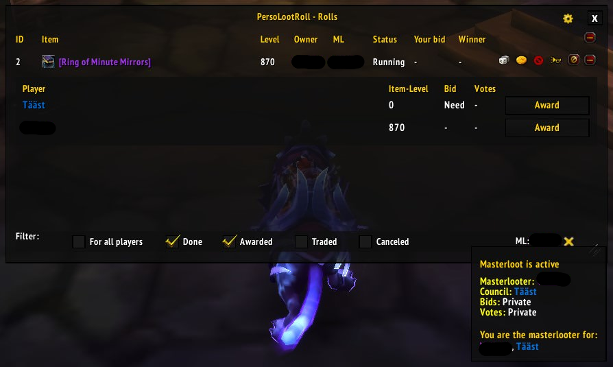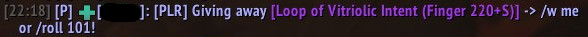 You also get a similar Keep-Greed-GiveAway roll window when you loot something that your party members might be interested in. If you choose "Greed" or "Give Away", then PLR offers the item to your group through party chat and handles accepting bids, picking a winner and trading the item for you. If you choose "Keep" on the other hand, then it'll automatically answer incoming whisper requests with "I need that myself".