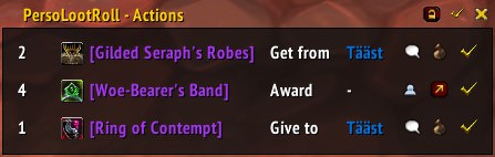 Whenever an item drops for someone in your group that might be an upgrade for you, you will get a good old Need-Greed-Pass roll window (remember those? :P) to decide if you want it or not. Rolling "Need" or "Greed" will add the item to your actions list (see below) for easy asking and trading, and optionally automatically send a whisper message to the owner asking for the item. If the owner uses PLR or another compatible addon as well, then all this happens in the background without need for whisper messages.