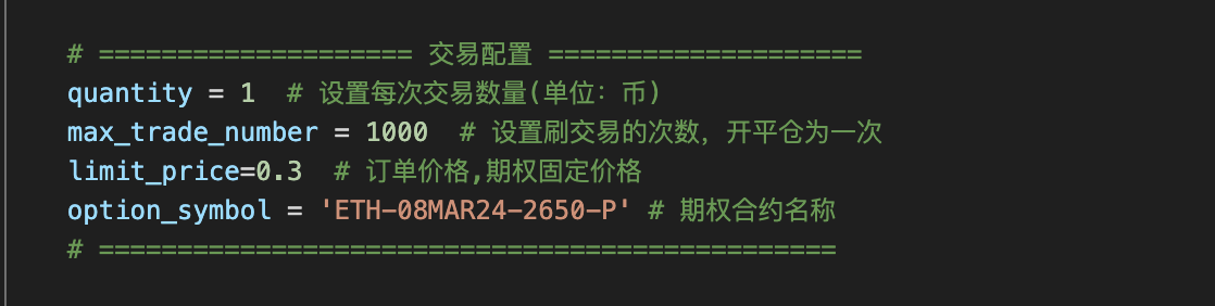 刷期权的程序是aevo_option_trade.py,交易策略是根据设定的价值同时挂相同价格的买单和卖单。